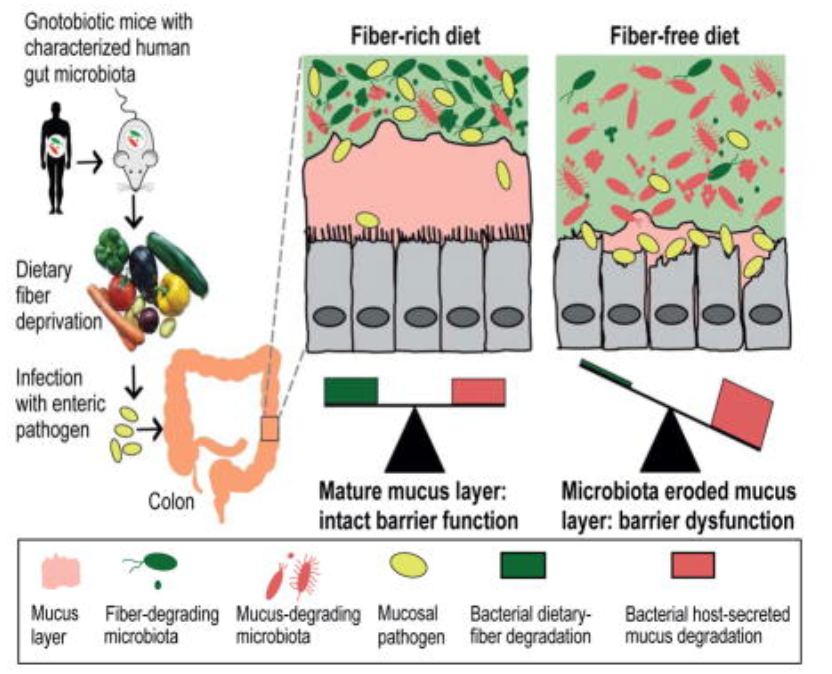 Desai MS, Seekatz AM, Koropatkin NM, Kamada N, Hickey CA, Wolter M, Pudlo NA, Kitamoto S, Terrapon N, Muller A, Young VB, Henrissat B, Wilmes P, Stappenbeck TS, Núñez G, Martens EC. A Dietary Fiber-Deprived Gut Microbiota Degrades the Colonic Mucus Barrier and Enhances Pathogen Susceptibility. Cell. 2016 Nov 17;167(5):1339-1353.e21. doi: 10.1016/j.cell.2016.10.043. PMID: 27863247; PMCID: PMC5131798.